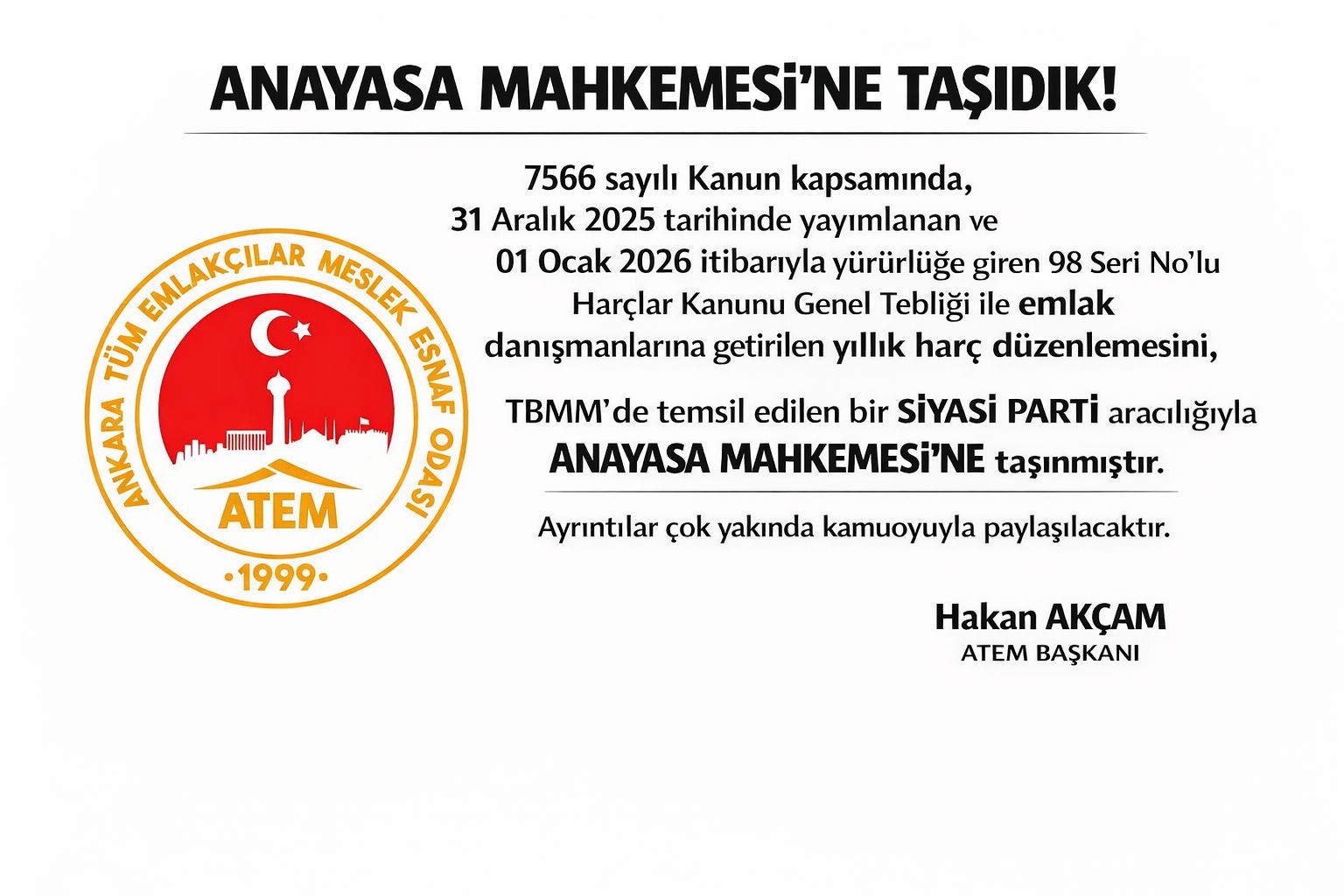 SATEM Başkan adayı Nejdet Kılıç, emlak danışmanlarına getirilen yıllık harç düzenlemesinin Anayasa Mahkemesi'ne taşındığını söyledi.