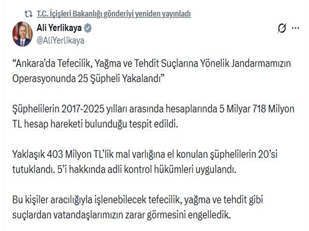 - İÇİŞLERİ Bakanı Ali Yerlikaya, Ankara'da 'tefecilik', 'yağma' ve 'tehdit' suçlarına yönelik düzenlenen operasyonda 25 şüphelinin yakalandığını, 20'sinin tutuklandığını açıkladı.