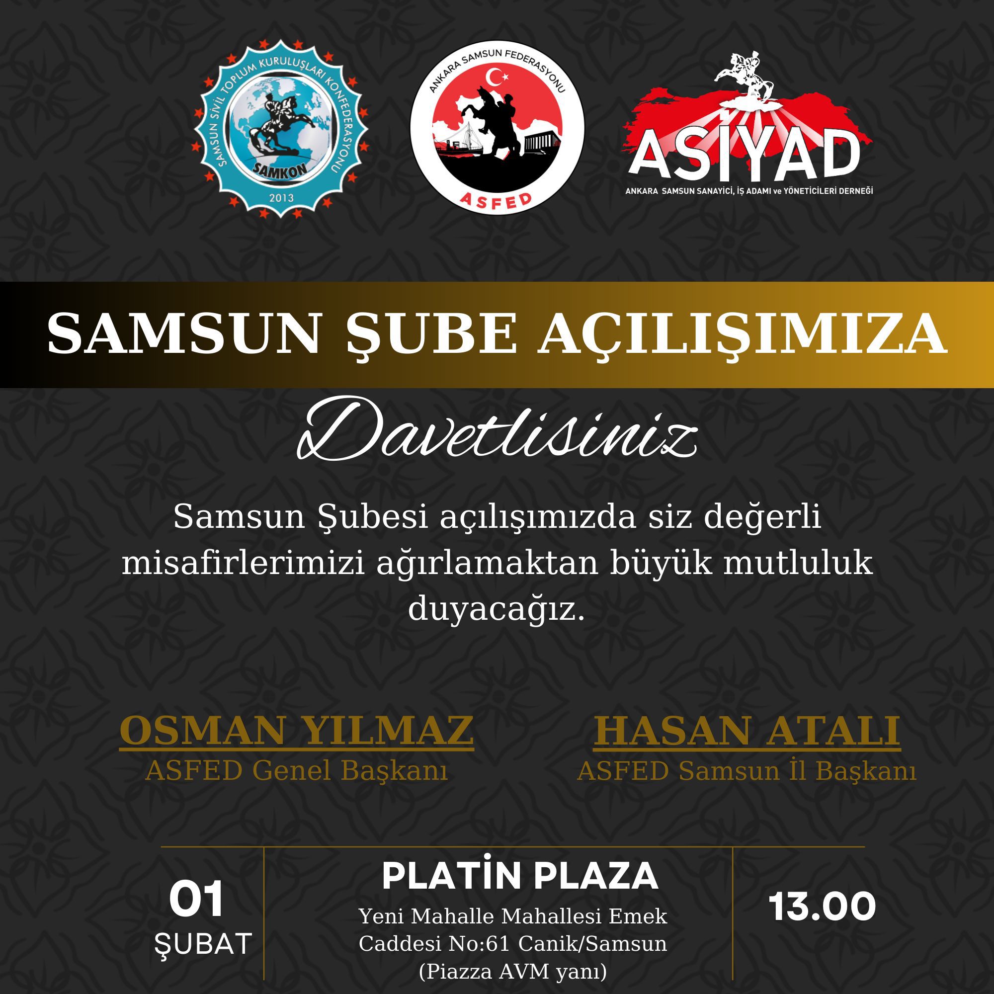 ASFED Genel Başkanı, Samsunlu genç iş insanı Osman Yılmaz, açılış dolayısıyla yaptığı açıklamada tüm Samsun halkını programa davet ederek birlik ve beraberlik mesajı verdi.
