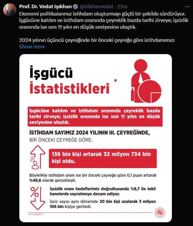 İşsizlik oranının yüzde 8,7 ile tekli hanelerde seyretmeye devam ettiğini aktaran Işıkhan, "İş gücüne katılım oranında kaydettiğimiz 116 bin kişilik artış, attığımız adımların doğru olduğunu kanıtlıyor. 35 milyon 840 bin kişiye ulaşan iş gücü sayımızı artırmaya devam edeceğiz. Orta Vadeli Program (OVP) beklentilerimize göre iyi performans gösteren işsizlik oranı geçtiğimiz yılın aynı dönemine göre 0,5 puan azaldı. Bir önceki yılın aynı dönemine göre, istihdam oranımızda 1,2 puan, iş gücü katılma oranımızda ise 1 puan artış kaydettik. OVP hedeflerimiz doğrultusunda, istihdam olanaklarını artıracak, işsizliği azaltacak çalışmalarımızı sürdüreceğiz. Gençlerin ve kadınların iş gücü piyasasına katılımını destekleyecek adımlarımızı kararlılıkla uygulayacağız" açıklamasında bulundu.