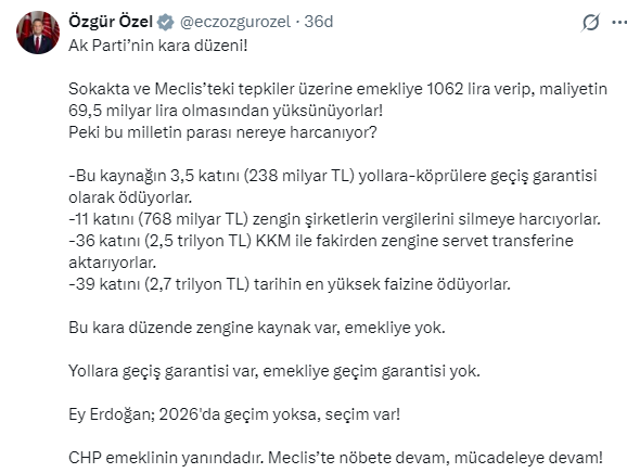 CHP Genel Başkanı Özgür Özel, emekli maaşlarına yapılan artışla ilgili açıklama yaptı.