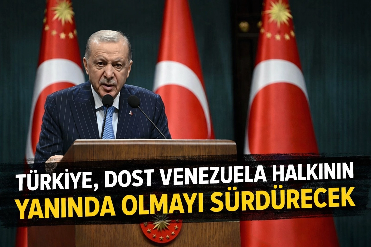 Erdoğan, ABD'nin Venezuela'ya gerçekleştirdiği saldırıya ilişkin, "Dünyanın neresinde olursa olsun, siyasi meşruiyeti ve uluslararası hukuku ihlal eden hiçbir eylemi tasvip etmeyiz. Venezuela meselesinde de hem Türkiye için hem dost Venezuela halkı için en iyisi, en doğrusu neyse, onu yapmanın gayretindeyiz. Sayın Maduro ve Venezuela halkı, milletimizin dostu olduğunu pek çok kez göstermiştir. İki dost ülke olarak, zor günlerimizde birbirimizle dayanışma içinde olmaya önem ve öncelik verdik. Bugün de aynı anlayışla hareket ediyoruz. Ülkelerin egemenlik haklarının ihlal edilmesi ve uluslararası hukukun çiğnenmesi, küresel düzeyde ciddi komplikasyonlara yol açabilecek riskli adımlardır. 'Hukukun gücü' yerine 'gücün hukukunun' egemen olduğu bir dünyada; istikrarsızlık, kriz, çatışma eksik olmaz. Biz, Türkiye olarak, ne bölgemizde ne başka coğrafyalarda, kaos, kargaşa ve gerilim olmasını asla istemeyiz. Kurallara dayalı uluslararası sistemin korunması bu bakımdan önemlidir. Bugünkü Kabine Toplantımızda, ilgili birimlerimizin derlediği güncel bilgiler ışığında, Venezuela vakasını enine boyuna değerlendirdik. Amerikan Başkanı Sayın Trump'la telefon görüşmemizde de, ülkemizin hassasiyetlerini kendisine ilettik. Venezuela’nın istikrarsızlığa sürüklenmemesi gerektiğinin altını çizdik. Türkiye ve Türk Milleti; refah, huzur, kalkınma mücadelelerinde dost Venezuela halkının yanında olmaya devam edecektir."