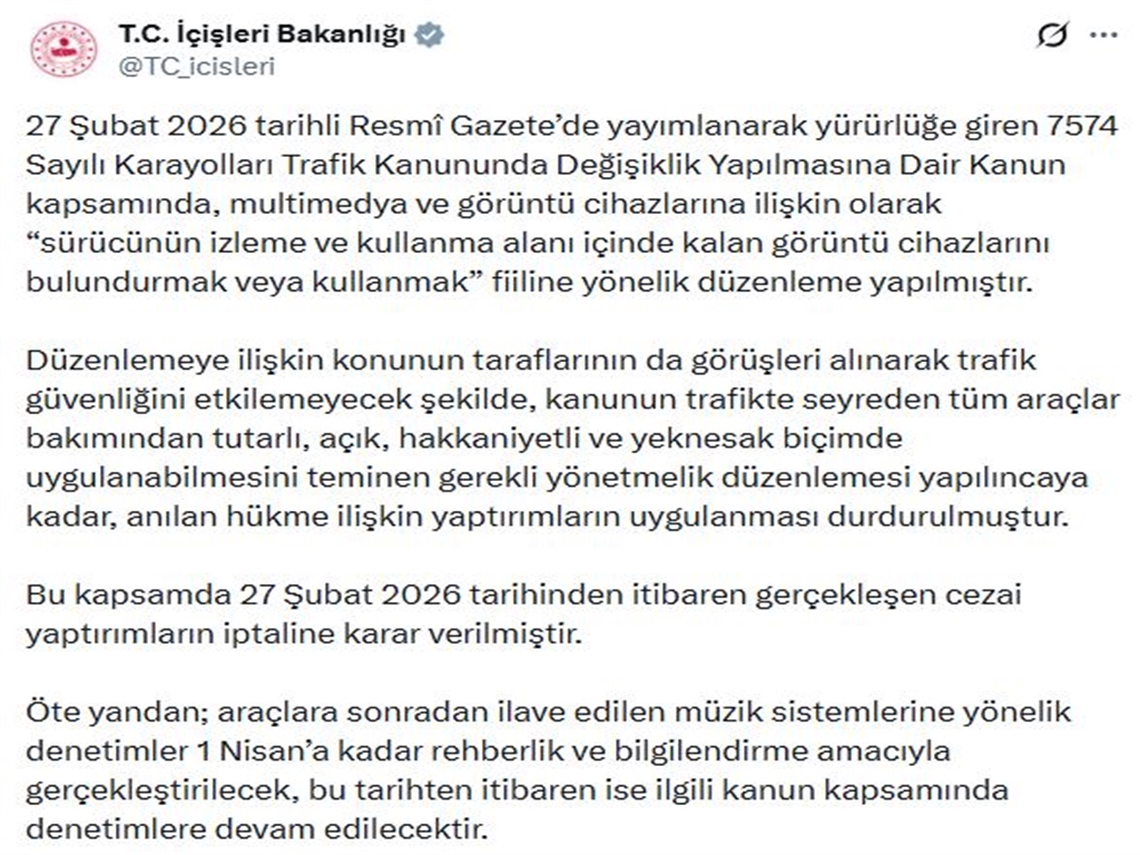 Bakanlığın sanal medya hesabından yapılan açıklamada, "27 Şubat 2026 tarihli Resmi Gazete'de yayımlanarak yürürlüğe giren 7574 Sayılı Karayolları Trafik Kanununda Değişiklik Yapılmasına Dair Kanun kapsamında, multimedya ve görüntü cihazlarına ilişkin olarak 'sürücünün izleme ve kullanma alanı içinde kalan görüntü cihazlarını bulundurmak veya kullanmak' fiiline yönelik düzenleme yapılmıştır. Düzenlemeye ilişkin konunun taraflarının da görüşleri alınarak trafik güvenliğini etkilemeyecek şekilde, kanunun trafikte seyreden tüm araçlar bakımından tutarlı, açık, hakkaniyetli ve yeknesak biçimde uygulanabilmesini teminen gerekli yönetmelik düzenlemesi yapılıncaya kadar, anılan hükme ilişkin yaptırımların uygulanması durdurulmuştur. Bu kapsamda 27 Şubat 2026 tarihinden itibaren gerçekleşen cezai yaptırımların iptaline karar verilmiştir. Öte yandan; araçlara sonradan ilave edilen müzik sistemlerine yönelik denetimler 1 Nisan'a kadar rehberlik ve bilgilendirme amacıyla gerçekleştirilecek, bu tarihten itibaren ise ilgili kanun kapsamında denetimlere devam edilecektir" denildi. (DHA)