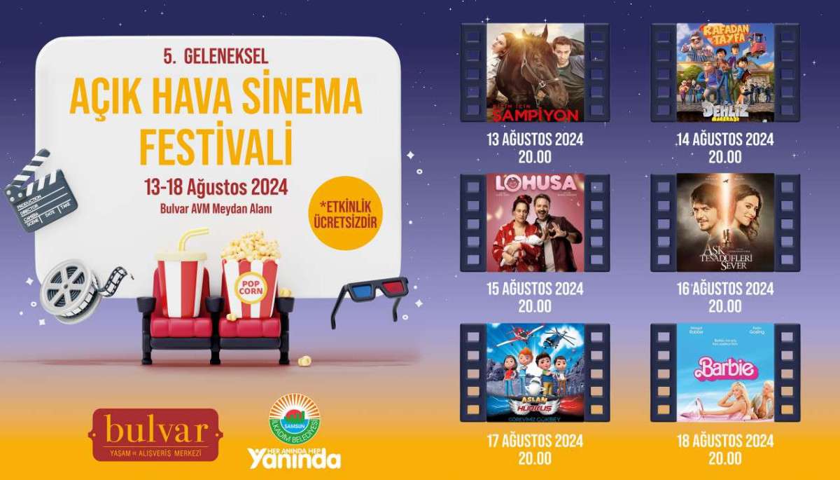 İlkadım Belediyesi, sosyal belediyecilik anlayışıyla kültür ve sanat faaliyetlerine devam ediyor. 13-18 Ağustos 2024 tarihlerinde Cumhuriyet Meydanı yanındaki AVM meydan alanında saat 20.00'de ‘Bizim İçin Şampiyon' filmi ile başlayacak olan ‘Açık Hava Sinema Festivali' tüm vatandaşlara ücretsiz olacak.