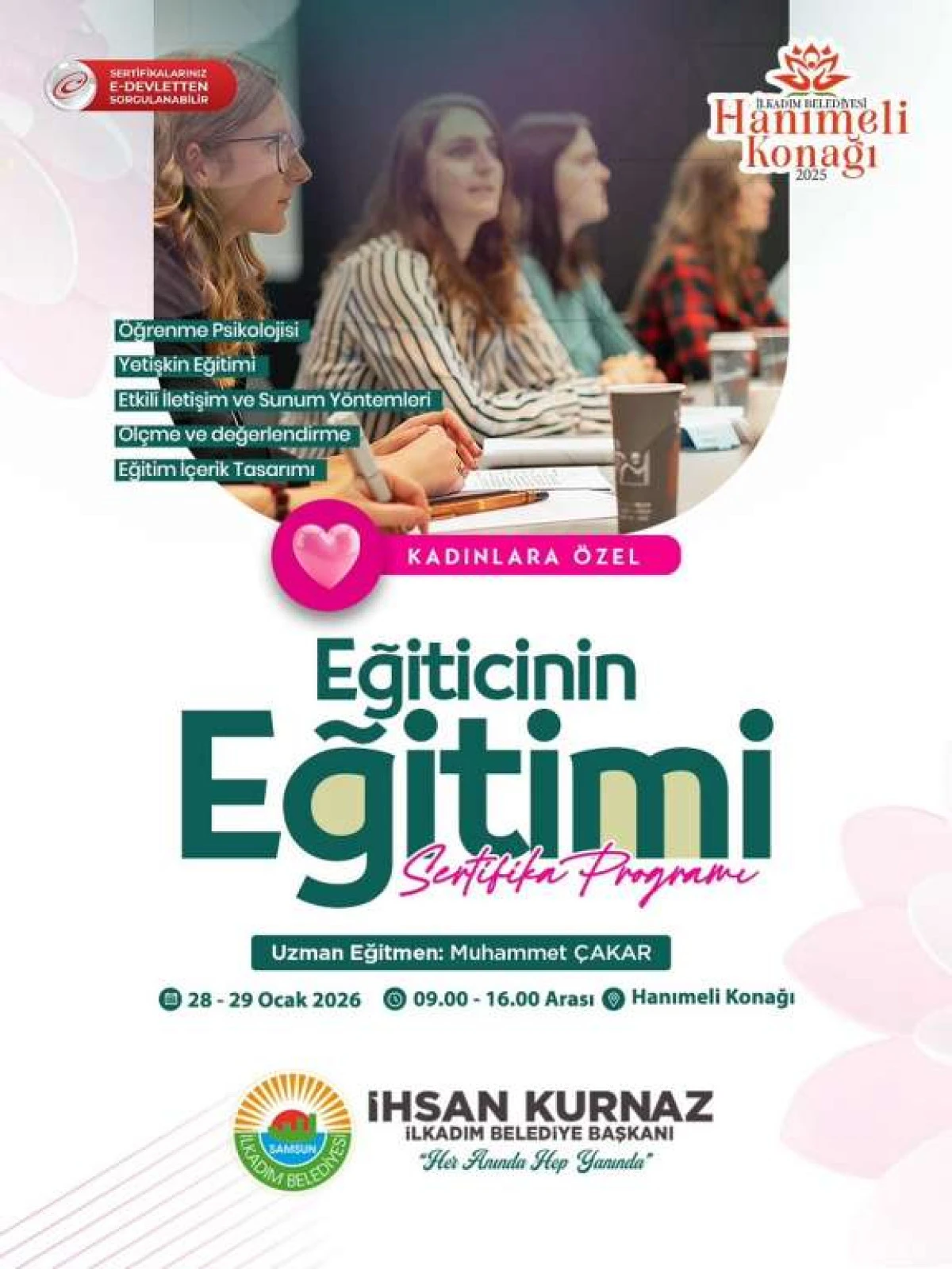 Kadınlara yönelik eğitimlere kararlılıkla devam ettiklerini belirten İlkadım Belediye Başkanı İhsan Kurnaz, “İş hayatında, sosyal hayatta, aile yaşamında ve kişisel gelişim alanlarında kendini daha güçlü hissetmek isteyen kadınlarımıza yönelik eğitimlerimizi sürdürüyoruz. Kadınlara özel mekânımız olan Hanımeli Konağı’nda, bu kez en az ön lisans mezunu eğitimci kadınlarımıza yönelik ‘Eğiticinin Eğitimi’ sertifika programını başlatıyoruz. Program kapsamında Öğrenme Psikolojisi, Etkili İletişim ve Sunum Yöntemleri, Ölçme ve Değerlendirme ile Eğitim İçerik Tasarımı konularında iki gün boyunca ücretsiz ve nitelikli bir eğitim verilecek. Üniversite onaylı programın sonunda ise online sınav yapılacak. Kontenjanı sınırlı olan eğitim programımıza başvurular, www.ilkadim.bel.tr/E-Kurs adresi üzerinden online olarak alınmaktadır. Kendisini alanında daha da geliştirmek isteyen kadın eğiticilerimizin bu fırsatı değerlendirmelerini temenni ediyorum” dedi.