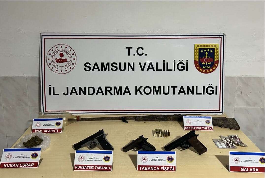 Olayın öğrenilmesinin ardından Samsun İl Jandarma Komutanlığı Kaçakçılık ve Organize Suçlarla Mücadele Şube Müdürlüğü, İstihbarat Şube Müdürlüğü, Uyuşturucu Madde Arama Köpek Unsuru ve Bafra İlçe Jandarma Komutanlığı ekiplerince şahsın evinde yapılan aramada 26 adet sentetik ecza hapı, 35 gram esrar maddesi, 2 adet 9 mm tabanca, 1 adet 7.65 mm tabanca, 1 adet ruhsatsız av tüfeği, mühimmat ve 1 adet uyuşturucu kullanma aparatı ele geçirildi.