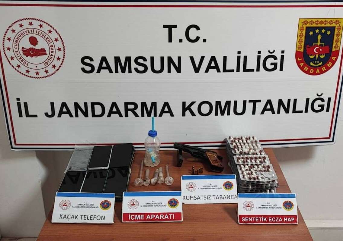 Samsun'un Atakum ilçesinde İl Jandarma Komutanlığı Kaçakçılık ve Organize Suçlarla Mücadele Şube Müdürlüğü, İstihbarat Şube Müdürlüğü ve Atakum İlçe Jandarma Komutanlığı ekipleri tarafından H.Ö. isimli şahsın uyuşturucu madde bulundurduğu bilgisine ulaşılması üzerine şahsın ikamet ve işyerinde arama yapıldı. Yapılan aramada 847 adet sentetik ecza hap, 6 adet uyuşturucu kullanma aparatı, 1 adet ruhsatsız tabanca, 14 adet kaçak telefon ve 6 adet tabanca fişeği ele geçirildi.