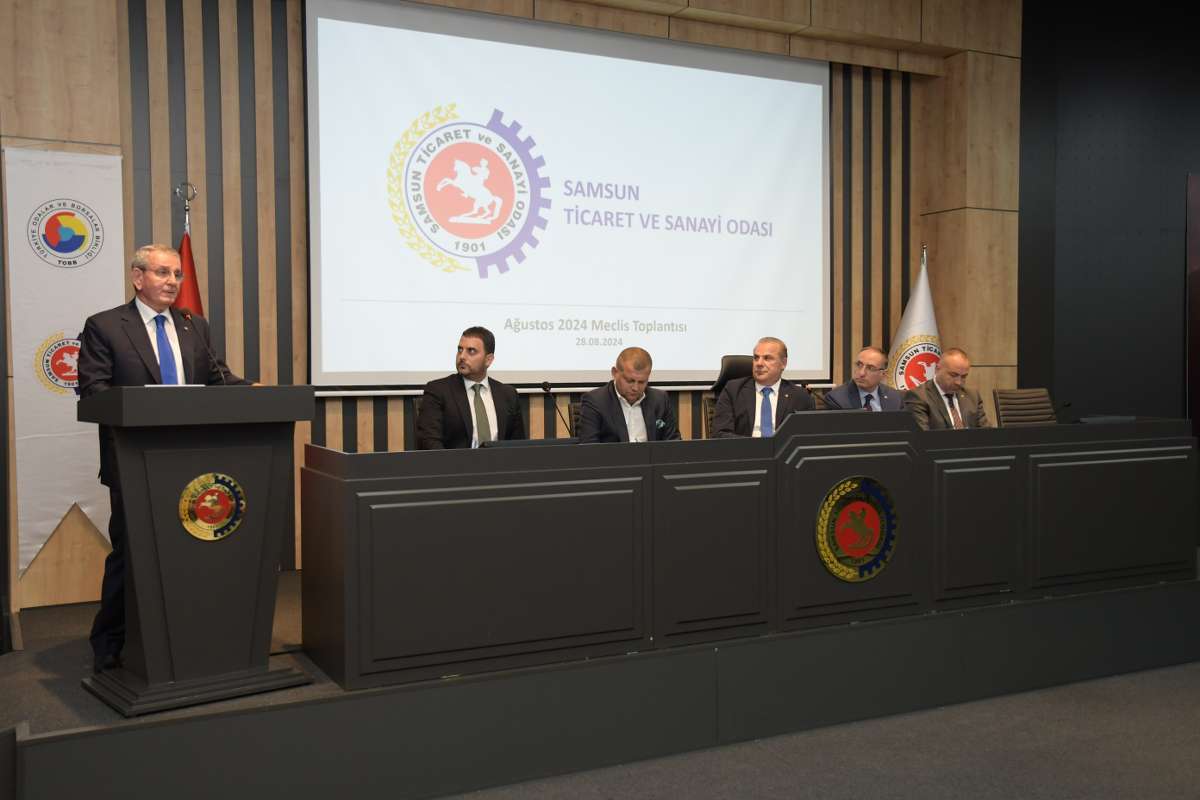 Samsun TSO 2024 yılı Ağustos ayı Olağan Meclis Toplantısı, Meclis Başkanı Haluk Akyüz başkanlığında gerçekleştirildi. Toplantıda söz alan Yönetim Kurulu Başkanı Salih Zeki Murzioğlu, iki toplantı arasında yürüttükleri faaliyetler ve gündeme ilişkin konular hakkında meclisi bilgilendirdi. Başkan Murzioğlu, Türkiye Odalar ve Borsalar Birliği (TOBB) Başkanı M. Rifat Hisarcıklıoğlu başkanlığında bu ay içerisinde Cumhurbaşkanı Yardımcısı Cevdet Yılmaz’ın katılımı ile yapılan, “TOBB Yönetim Kurulu İstişare Toplantısı” ve Sağlık Bakanı Prof. Dr. Kemal Memişoğlu’nun katılımıyla gerçekleşen, “TOBB Sağlık Sektörü İstişare Toplantısı” hakkında meclis üyelerine açıklamalarda bulundu.