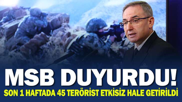 MİLLİ Savunma Bakanlığı (MSB) Basın ve Halkla İlişkiler Müşaviri Tuğamiral Zeki Aktürk, "Irak ve Suriye'nin kuzeyi dahil; son 1 haftada 45 terörist etkisiz hale getirilmiş, 1 Ocak'tan bugüne kadar etkisiz hale getirilen terörist sayısı 2 bin 194 olmuştur" dedi.