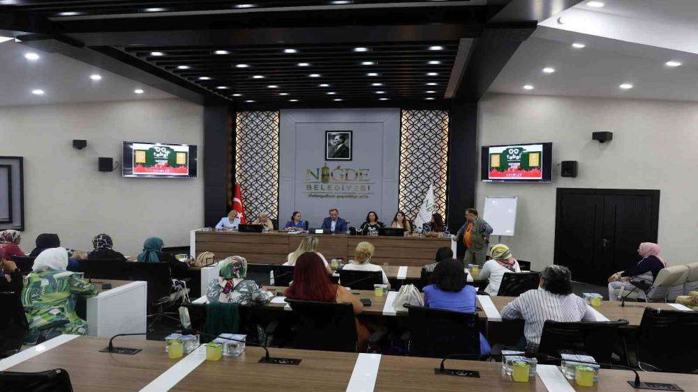 Niğde Belediyesi Meclis salonunda gerçekleştirilen Niğde Kadın Kooperatiflerinin, kadın kooperatif adaylarının ve markalı kadın üreticilerin katıldığı durum değerlendirme toplantısında Niğde Belediye Başkan Yardımcısı Ali İlker Atabay, Niğde Belediyesi Kentsel Tasarım Müdürü Ezgi Bor, Niğde Belediyesi Kadın ve Aile Hizmetleri Müdürü Yasemin Bircan, Niğde Belediyesi Kültür ve Sosyal İşleri Müdürü Burak Avcuoğlu, NÖHÜ Turizm ve Otel İşletmeciliği Bölüm Başkanı Doç. Dr. Ebru Kemer, İŞKUR Müdür Yardımcısı Ayşegül Özdemir nasıl katkı saylayabilecekleriyle ilgili konuşma yaptı.
