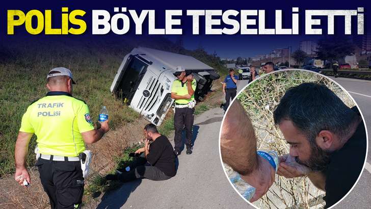 Samsun'da 22 ton paket tavuk yüklü tırın devrilmesi sonucu meydana gelen trafik kazasında, trafik polisi kazanın şokunu üzerinden atamayan tır sürücüsünü su ikram edip teselli etti.
