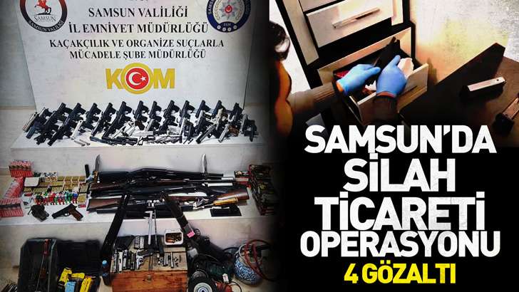 İl Emniyet Müdürlüğü Kaçakçılık ve Organize Suçlarla Mücadele Şube Müdürlüğü ekipleri, silah ticaretine yönelik yürüttüğü çalışmada; İlkadım, Canik, Asarcık, Kavak ve Salıpazarı ilçelerindeki belirtilen ikamet ve iş yerlerine operasyon düzenledi. Yapılan aramalarda; 41 ruhsatsız tabanca, 9 kurusıkı tabanca, 8 ruhsatsız tüfek, 14 namlu, 8 tabanca sürgüsü, 2 tabanca gövdesi, 55 şarjör, 3 bin 589 tabanca fişeği, 209 kartuş, tabanca parçası, mengene, kumpas, matkap, pürmüz ve taşlama aletleri ele geçirildi. Olayla ilgili B.U., M.A., A.D. ve Y.K. gözaltına alındı.