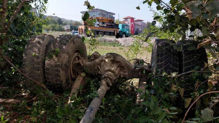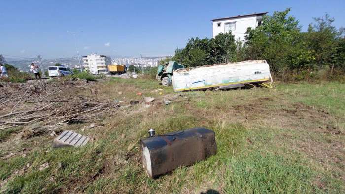 Samsun'da yoldan çıkan sulama tankerinin şarampole yuvarlanması sonucu meydana gelen trafik kazasında 1 kişi ağır yaralanırken, yerinden çıkan aracın dingilleri bir evin bahçesine savruldu.