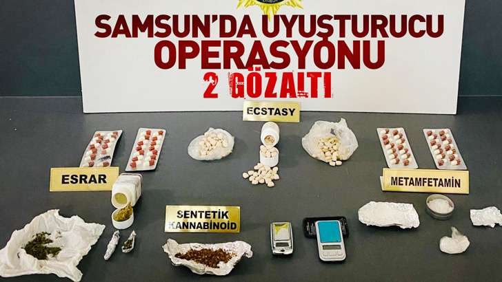 Edinilen bilgiye göre, Samsun Emniyet Müdürlüğü Narkotik Suçlarla Mücadele Şube Müdürlüğü ekipleri alınan istihbari bilgiler doğrultusunda Atakum ilçesi Küçükkolpınar Mahallesi ile İlkadım ilçesi Cedit Mahallesi'nde bulunan 2 zehir tacirinin ikametlerine operasyon düzenledi. Yapılan aramalarda, 1079 adet sentetik ecza, 267 adet ecstasy, 13,51 gram metamfetamin, 3,41 gram esrar, 1,19 gram sentetik kannabinoid, 2 adet hassas terazi, 2 adet uyuşturucu kullanım aparatı ele geçirdi. Olayla ilgili 2 kişi gözaltına alındı.