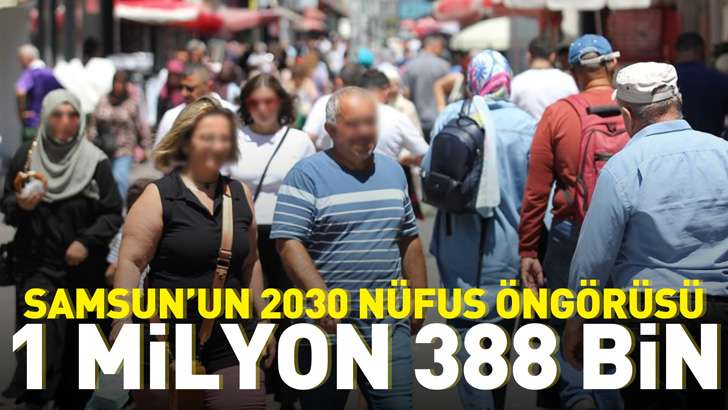 Samsun'un 2030 yıllık ortalama nüfus artış hızı 1,2 olarak bekleniyor. Nüfus projeksiyonlarına göre şu anda 1 milyon 377 bin 546 olan Samsun'un 2024'te 1 milyon 379 bin 1, 2025'te 1 milyon 381 bin 318, 2026'da 1 milyon 383 bin 308, 2027'de 1 milyon 385 bin 31, 2028'de 1 milyon 386 bin 577, 2029'da 1 milyon 387 bin 912 ve 2030'da ise 1 milyon 388 bin 937 kişi olması öngörülüyor.